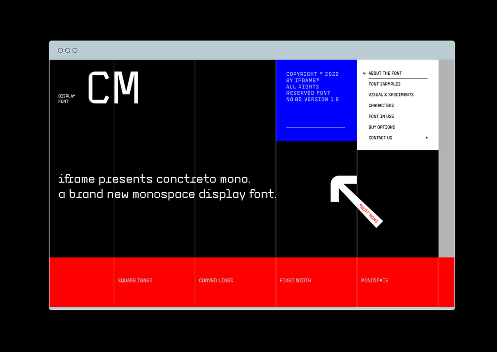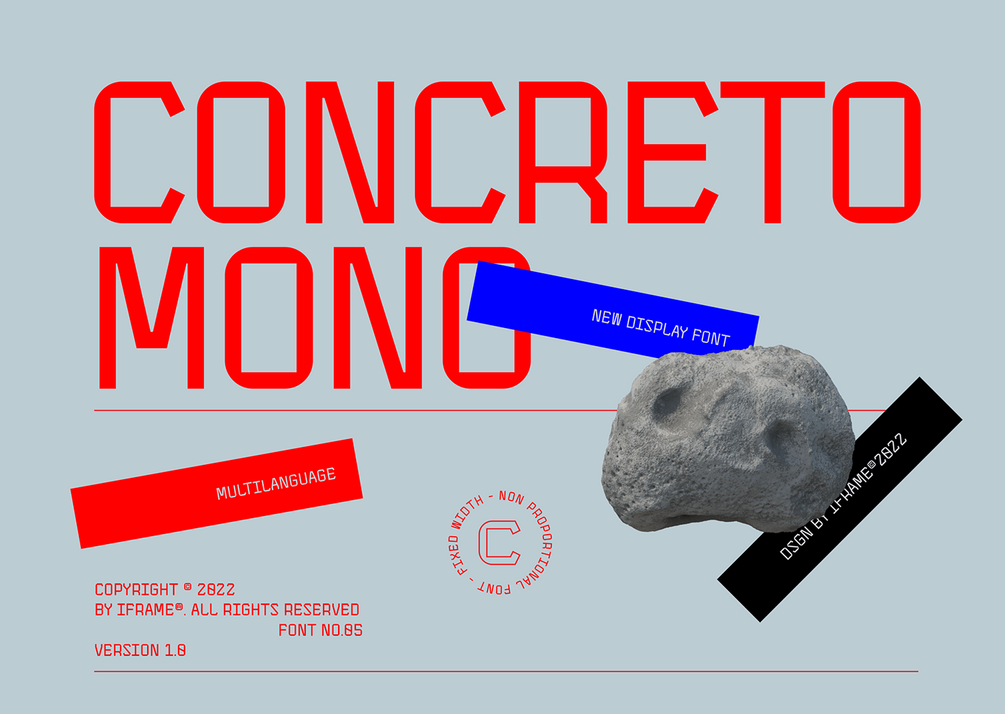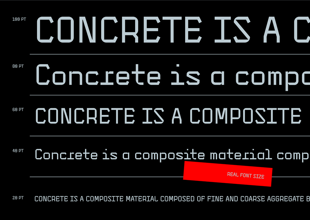 Concreto Mono is a monospaced san serif, built in regular style. The word concrete comes from the Latin word "concretus" meaning compact.