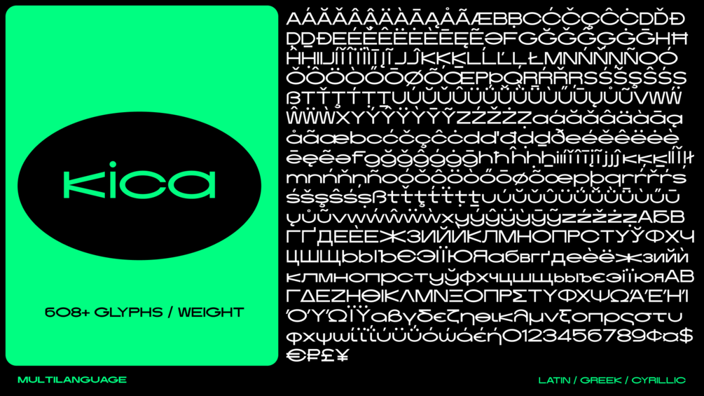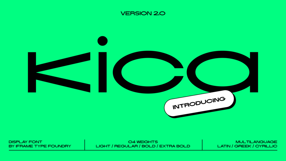 Kica is a modern display typeface that is characterized by its clean lines, bold strokes, and geometric shapes. This typeface was designed with the intention of creating a strong visual impact and capturing attention.